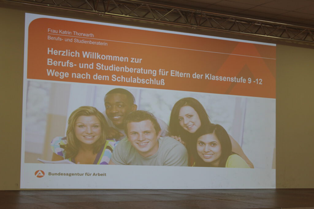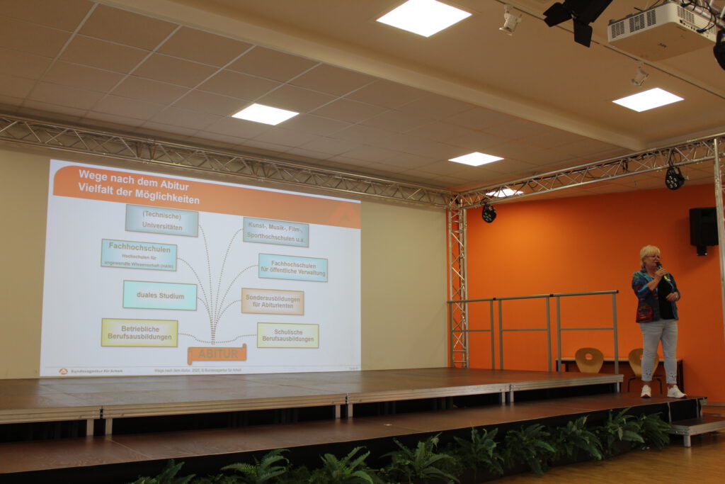 Als die Uhr fünf schlug, hatten sich die Interessierten bereits in der Aula versammelt, um gespannt dem Vortrag von Frau Thorwarth zu lauschen. Sie sprach über die verschiedenen Bildungswege, die einem hier zur Verfügung stehen, und die Zukunftsmöglichkeiten, die sich mit jedem Abschluss eröffnen. Der höchstmögliche Bildungsabschluss, den die Schülerinnen und Schüler an unserer Schule erreichen können, ist allseits bekannt: das Abitur. Nur mit ihm besteht die Möglichkeit auf ein Studium an einer Universität, wie zum Beispiel der Otto-von-Guericke-Universität in Magdeburg, die ebenfalls vertreten war. Neben diesem klassischen Weg mit dem Abschluss der 12. Klasse kann das Abitur alternativ auch über ein Fachgymnasium nachgeholt werden. Dafür benötigt man einen erweiterten Realschulabschluss, den man nach der 10. Klasse am Gymnasium erhalten kann. Doch Frau Thorwarth machte auch deutlich, dass das Abitur nicht der einzige Zugang zu einem Studium ist. Viele denken vielleicht: „Um studieren zu können, brauche ich ein Abitur.“ Doch das ist falsch. Auch ohne Abitur besteht die Möglichkeit zu studieren – und zwar an einer Hochschule. Dafür benötigt man lediglich die Fachhochschulreife. Für diejenigen jedoch, die sich gar nicht für ein Studium interessieren oder lieber praktisch arbeiten möchten, gibt es selbstverständlich auch andere Wege. Eine Ausbildung stellt eine ebenso wertvolle Alternative dar.