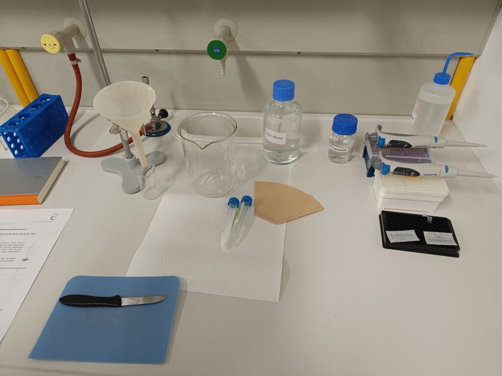 Im zweiten Versuch stellten die Schülerinnen und Schüler zunächst eine Lösung aus Spülmittel, Kochsalz und destilliertem Wasser her. In diese wurden Bananenstücke gegeben und anschließend mit einem Pürierstab zerkleinert, bis eine smoothieartige Masse entstand. Aus dieser Mischung wurden etwa 20 Milliliter durch einen Filter gewonnen. Anschließend wurde noch eine ähnliche Menge Isopropanol (Laboralkohol) hinzugegeben.