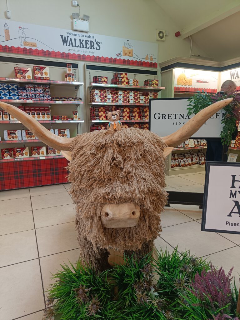 Am nächsten Morgen, gegen sechs Uhr britischer Zeit (eine Stunde später als in Deutschland), legte die Fähre im englischen Hull an. Im Showroom warteten alle darauf, endlich von Bord zu dürfen – und das dauerte ewig! Ich hatte schon Angst, mein Fell würde bis dahin grau werden. Endlich im Bus, fuhren wir im Linksverkehr durch grüne Landschaften, vorbei an Schafen, Kühen und noch mehr Schafen. Unser erstes Ziel war Gretna Green, gleich hinter der schottischen Grenze.